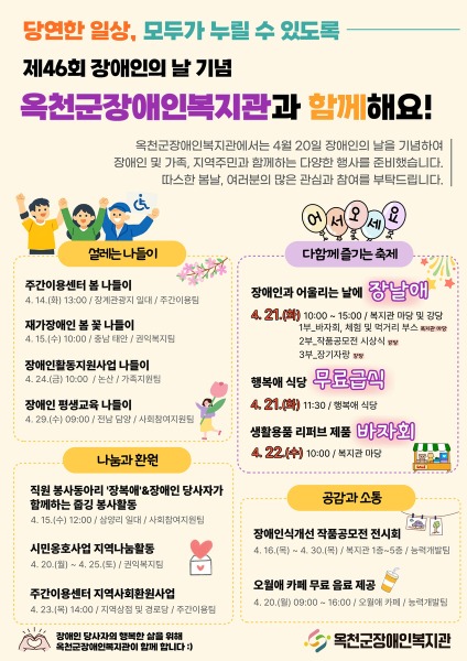 옥천군장애인복지관(관장 황명구)은 '제46회 장애인의 날'을 맞아 오는 4월 13일부터 30일까지 다양한 기념행사를 운영한다.