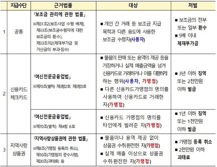 아울러 지역별 '부정유통 신고센터'를 운영해 가맹점을 수시 단속하고 온라인 커뮤니티 등에서 개인 간 거래가 발생하지 않도록 모니터링을 강화해 줄 것을 각 지방정부에 요청했다.