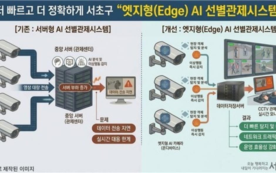 서울 서초구가 전국 최초로 '엣지형 AI 선별관제시스템'을 도입해 본격 운영에 나선다고 밝혔다. AI 카메라가 현장에서 영상을 직접 분석한 뒤 선별된 정보를 관제센터로 전송하는 방...
