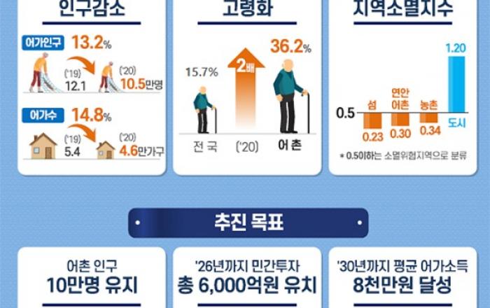 어촌의 문을 열고 주거지원을 늘려 ‘활력어촌’ 만들기에 나선다. 양식업·마을어업 면허제도를 개선해 청년 어선 임대사업을 하고 어업에 직접 종사하지 않는 귀촌인 지원을 위해 ‘준귀어인’ 제도도 운영한다. 또한 국가어항·위판장에 민간자본 6000억원의 투자를 유치하는 한편