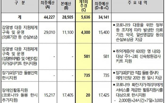 코로나19 확진자 증가에 대응해 치료병상 2만 5000개의 안정적 확보·운영을 위한 의료기관 손실보상 예산 4300억 원이 추가 확보됐다.또한 감염취약계층 및 어린이집 등 약 600만 명을 대상으로 주 1~2회 신속항원검사키트를 제공하고, 장기요양기관 돌봄종사자는 1인