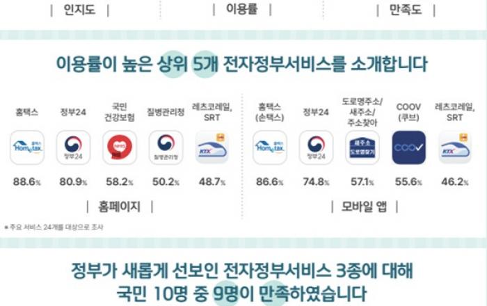2021년 한 해 동안 국민 10명 중 9명 정도가 전자정부서비스를 이용했고, 이 중 97.8%가 서비스에 만족한 것으로 나타났다.행정안전부는 24일 한국지능정보사회진흥원과 함께 2021년 국민이 많이 이용한 전자정부서비스를 포함해 서비스의 ▲인지도 ▲이용률 ▲만족도