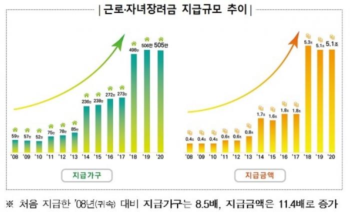 저소득층의 근로 의욕을 높이고 자녀 양육을 지원하기 위한 근로·자녀장려금 지급금액과 가구가 최근 3년간 크게 늘어난 것으로 나타났다.6일 국세청에 따르면 2020년 소득분 근로·자녀장려금이 505만 가구에 5조 1342억 원 지급됐다.근로·자녀장려금 제도는 일하는 저소