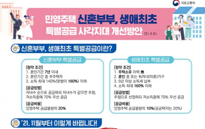청약 기회가 제한된 청년층을 위해 민영주택 특별공급에 추첨제가 도입된다.국토교통부는 지난달 26일 열린 청년특별대책 당정협의회의 후속 조치의 일환으로 현행 생애최초·신혼부부 특별공급 제도를 일부 개편한다고 8일 밝혔다.이번 제도 개선안은 1인 가구, 맞벌이 등으로 소득