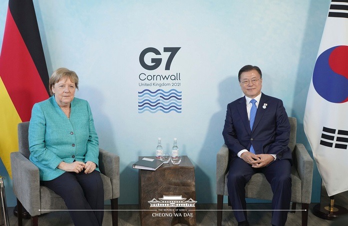 G7 정상회의 참석차 영국을 방문 중인 문재인 대통령은 12일(현지시간) 오후 앙겔라 메르켈 독일 총리와 회담을 갖고 G7 정상회의, 코로나19 대응, 한반도 정세 등에 대해 폭넓게 논의했다.
