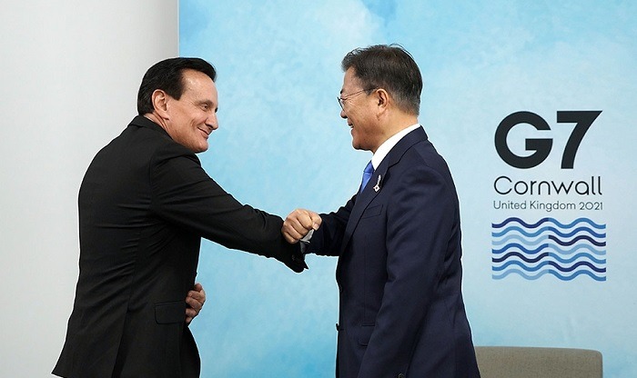 주요 7개국(G7) 정상회의 참석을 위해 영국을 방문 중인 문재인 대통령은 12일 오전(현지시간) 아스트라제네카사의 파스칼 소리오 글로벌 CEO를 면담했다.