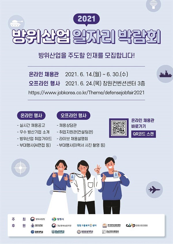 이번 방위산업 일자리 박람회는 코로나19 상황을 고려하여 온라인과 오프라인 방식을 병행하며, 6월 24일(목) 창원컨벤션센터에서 개최되는「2021 방위산업 부품.장비대전」(6.23.~6.25.)과 연계하여 오프라인 행사가 진행될 예정이다.