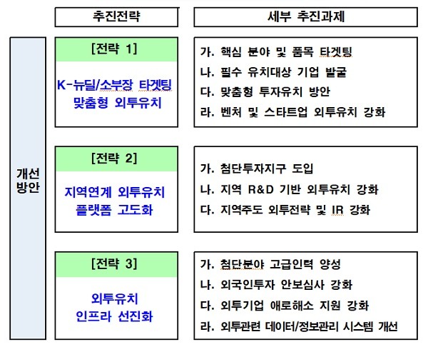 첨단 외국인투자유치 전략은 첨단산업의 세계공장화를 견인하는 외국인투자 유치정책으로 K-뉴딜·소부장 타겟팅 맞춤형 외투유치, 지역연계 외투유치 플랫폼 고도화, 외투유치 인프라 선진화 등 세가지 추진전략을 마련했다.