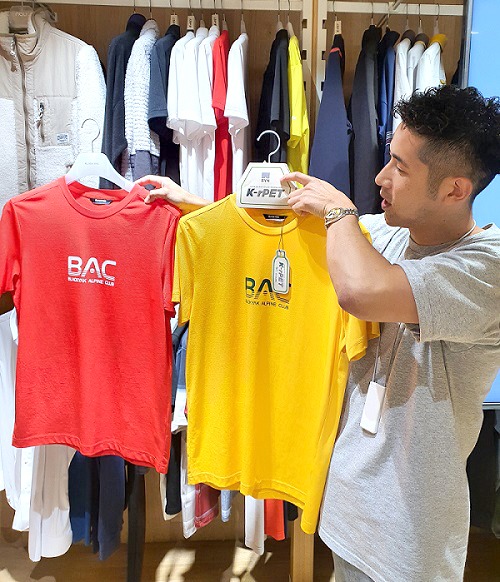BYN블랙야크 본사 매장에 걸려 있는 일반 티셔츠(A)와 리사이클 티셔츠(B). 유관상 구별할 수 있을까? 눈으로 봤을 때 어떤 옷이 리사이클 제품인지 구별하기 어렵다. 정회욱 대리는 “연구·개발을 꾸준히 한 결과, 색상도 원하는 색상으로 뽑을 수 있고, 아웃도어 브랜드이다 보니 단순히 재활용만 하는 것이 아니라 기능성 제품을 만들고 있다”고 말했다.