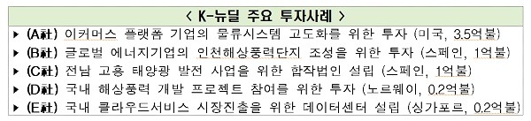 디지털 뉴딜 분야는 전자상거래, 온라인 플랫폼 등을 중심으로, 그린 뉴딜 분야는 해상풍력·태양광 발전 단지 개발 사업 등을 중심으로 유입돼 K-뉴딜 투자액이 39억 4000만 달러로 전년동기 대비 163.4% 증가했다.