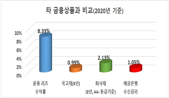 리츠의 배당수익률은 예금·국고채·회사채보다도 높다. 리츠는 예금은행 수신금리(1.05%)나 국고채 3년(0.99%), 회사채(2.13%) 등과 비교해도 높은 배당을 하면서 안정적인 수익률을 기록했다.