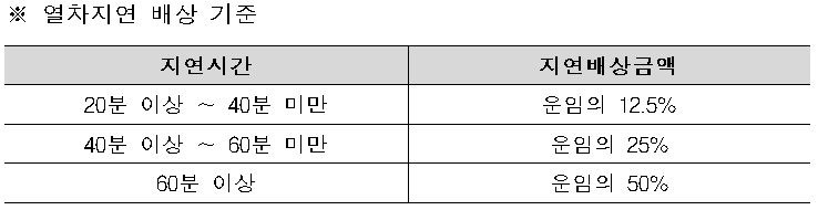 한국철도는 천재지변이나 안전을 위한 조치를 제외한 기타 사유로 열차가 20분 이상 늦으면, 공정거래위원회의 ‘소비자분쟁해결기준’에 의거해 승차권에 표시된 운임의 최대 50%를 환급하는 열차 지연배상 제도를 운영하고 있다.