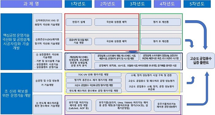 먼저 고순도 공업용수 생산 핵심공정(자외선 산화, 용존산소 탈기막) 국산화 및 설계·시공·운영 자립화를 위한 기술을 실증하고, 반도체 기업(대전 나노종합 기술원) 대상 파일럿(12톤/일)을 구축해 반도체 폐수 재이용률 향상을 위한 기술을 개발한다.