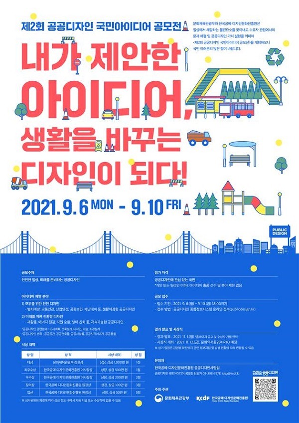 문화체육관광부는 한국공예·디자인문화진흥원(이하 공진원)과 함께 ‘제2회 공공디자인 국민 아이디어 공모전’을 개최한다고 2일 밝혔다.