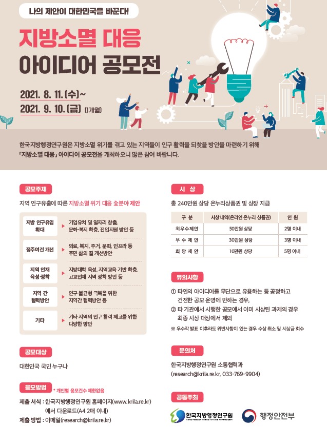 행정안전부와 한국지방행정연구원은 지방소멸 위기를 겪고 있는 지역들의 인구 유입과 활력 증진을 위해 『지방소멸 대응 대국민 아이디어 공모』를 실시한다고 밝혔다.