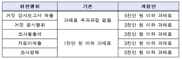이밖에 거짓 감사보고서 제출 및 거짓 공시행위에 대한 과태료 부과근거를 신설하고, 조사 불출석·자료 미제출·조사 방해에 대한 과태료 부과금액을 타 소비자법과 유사한 수준으로 높였다.