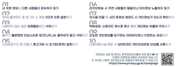 캠페인은 ‘무심코 털리는 개인정보, 따라하며 지키는 생활수칙’을 슬로건으로 정하고, 일상생활 속 개인정보 보호를 위한 생활수칙을 개발해 포스터 및 카드뉴스 등을 통해 집중 홍보하기로 했다.