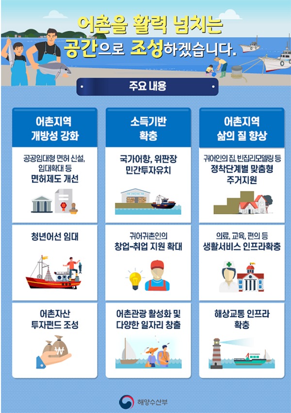 또한 국가어항·위판장에 민간자본 6000억원의 투자를 유치하는 한편, 이주·정착 단계별 맞춤형 주거지원을 하고 의료·교통 등 생활서비스 인프라를 확충한다.