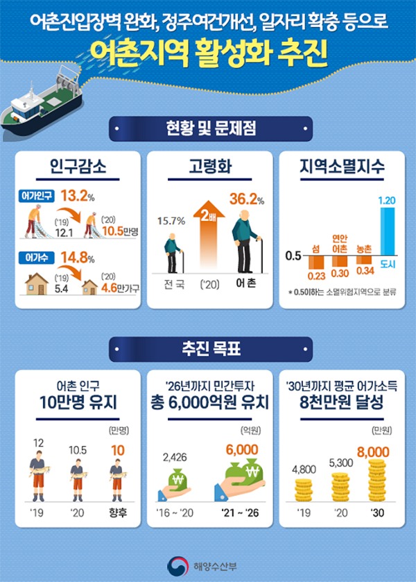 특히 어촌의 65세 이상 고령화율은 36.2%로, 전국 평균치인 15.7%보다 2배 이상 높은 것으로 나타나는 등 인구감소와 고령화로 인한 어촌 소멸 위기가 현실화되고 있다.