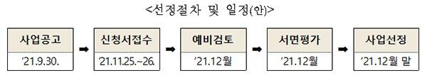 공모사업 접수기간은 다음달 25일부터 26일까지며, 관련 분야 전문가로 구성된 평가위원회의 평가 등을 거쳐 12월 말까지 최종 선정할 계획이다.