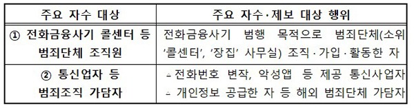전화금융사기 범죄단체 자수 대상자는 콜센터·발신 전화번호 변작·악성앱 제작 및 배포 등 전화금융사기 범죄조직에 가담해 범행한 전력이 있거나 내부 정보 등 관련 내용을 알고 있는 사람이다.