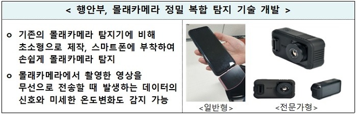 행정안전부는 한국전자기술연구원과 함께 인공지능(AI) 기술 등을 적용, 공중화장실, 숙박시설 등 다중이용시설에 설치된 몰래카메라를 누구나 손쉽게 확인할 수 있는 기술을 개발하였으며, 10월 13일(수)부터 현장에 시범적용 한다고 밝혔다.