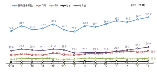 이와 관련해 홍콩 포함 중국은 24.0% 증가한 101억 2000만 달러, 베트남은 15.3% 증가한 35억 9000만 달러, 미국은 27.2% 증가한 25억 8000만 달러, 유럽연합은 11.2% 증가한 10억 9000만 달러, 일본은 10.7% 증가한 3억 7000만 달러 등이었다.