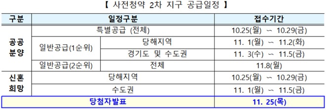 ‘공공분양주택’의 경우 오는 25~29일 5일간 특별공급에 대한 청약신청 접수가 진행되며 다음달 1~2일에는 일반공급 1순위 중 당해지역 거주자, 3~5일에는 경기도·수도권 거주자 접수가 진행된다.
