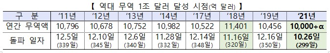 우리나라 무역은 2011~2014년, 2017~2019년 총 7회 1조 달러를 달성했으나 지난해 코로나19로 인한 세계 무역 침체로 1조 달러 이하(9801억 달러)로 감소한 이후, 올해 들어 곧바로 1조 달러를 회복했다.