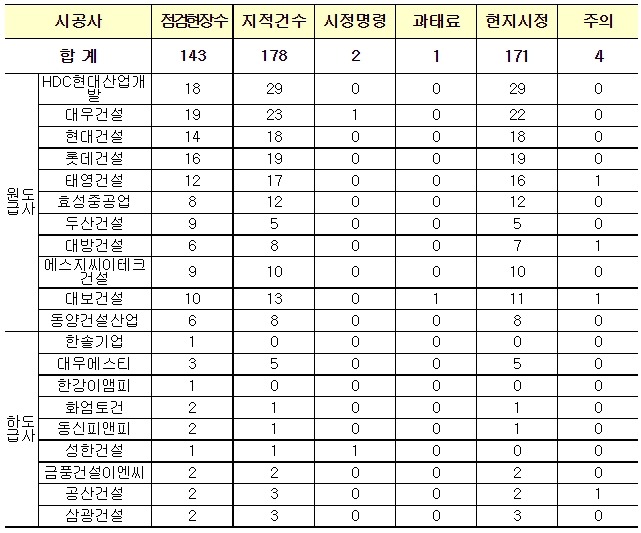 점검결과, 총 178건의 부적정 사례가 적발되었으며, 콘크리트 시험을 규정대로 실시하지 않는 등 품질관리를 부적합하게 수행한 현장에 대해서는 지방국토관리청에서 이의신청 등의 행정절차를 거친 후 벌점 및 과태료를 부과할 예정이다.