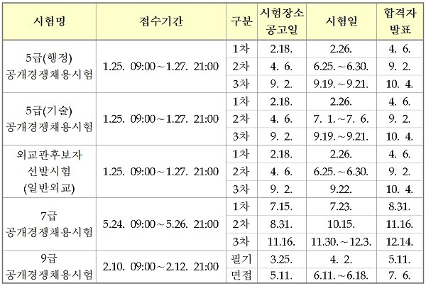 1차 시험은 2월 26일로 올해 대비 2주 정도 앞당겨졌다. 2차 시험은 5급 행정직·외교관후보자 선발시험(일반외교)의 경우 6월 25일부터 6월 30일까지, 5급 기술직의 경우 7월 1일부터 7월 6일까지 진행한다. 면접은 9월 19일부터 22일까지 해당 직류별로 실시한다.