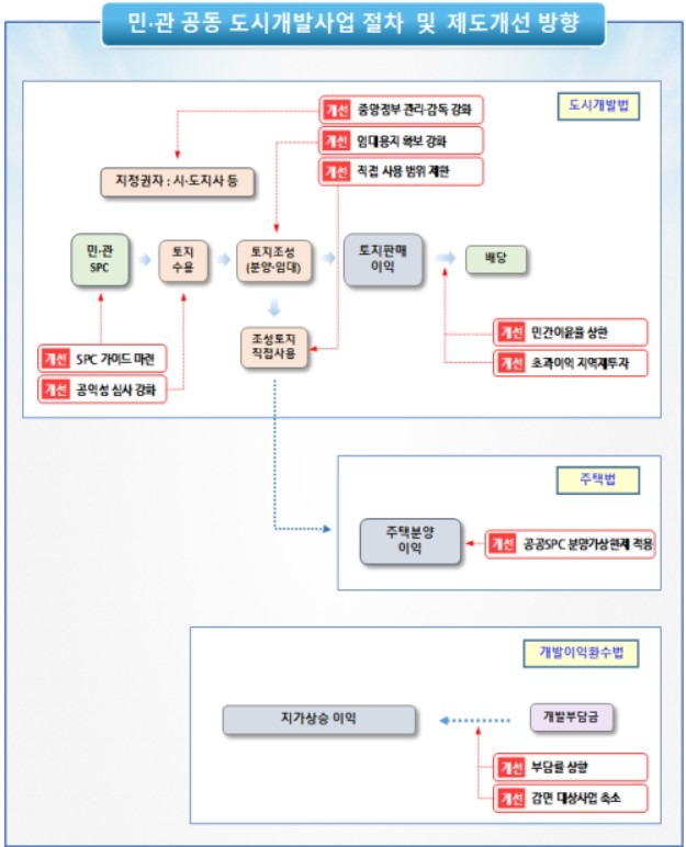 공공성 강화 방안에 따라 우선 국토부는 민·관이 공동으로 출자해 시행하는 도시개발 사업에서 토지조성·매각 과정 시 민간의 과도한 이익이 발생하지 않도록 민간 이윤율 제한을 추진할 예정이다.