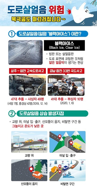 이윤상 국토부 도로국장은 “정부는 겨울철 도로사고 예방을 위해 사전 대비에 만전을 기하고 폭설이나 살얼음이 발생하는 경우, 즉시 국민에게 상황을 알리고 신속히 위험요소를 제거하는데 노력을 집중하겠다”며 “가장 효과적인 안전대책은 안전운전이므로 도로 이용자는 도로 살얼음 위험 및 교통사고 예방수칙과 눈길 안전운전 요령을 숙지·준수하고 눈길에서는 가급적 대중교통을 이용해달라”고 당부했다.