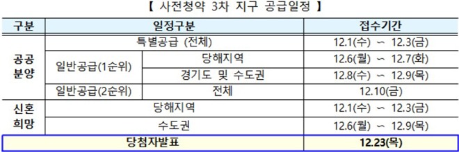 아울러 1·2차 사전청약 당첨자는 3차 사전청약 당첨자로 선정이 제한되므로 청약접수 전 당첨여부를 반드시 확인해야 한다.