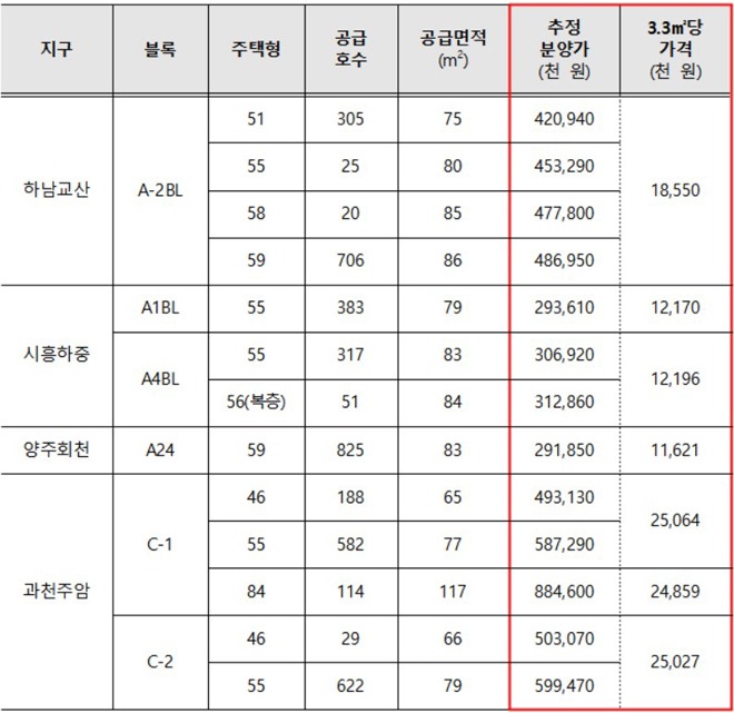 3.3㎡(평)당으로는 하남 교산·시흥 하중·양주 회천이 1162만 1000원 ~1855만원, 과천 주암은 2485만 9000원 ~ 2506만 4000원 수준이 될 전망이다.