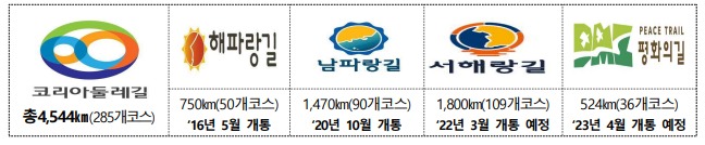 우리나라 외곽의 기존 길을 연결해 조성한 ‘코리아둘레길’은 총 4544㎞에 이르는 국내 최장 거리 걷기 여행길로서 비무장지대의 디엠지(DMZ) 평화의길, 동해의 해파랑길, 남해의 남파랑길, 서해의 서해랑길로 이뤄져 있다.