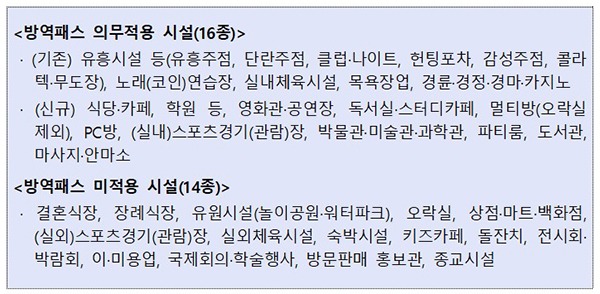다만 기본생활 영위에 필수적이거나 시설이용 특성상 방역패스 적용이 어려운 경우와 해당 시설의 특수성으로 인해 모임·행사 기준이 적용되는 경우, 그리고 시설의 개방성으로 출입관리가 용이하지 않은 경우 등은 방역패스 의무적용에서 제외한다.