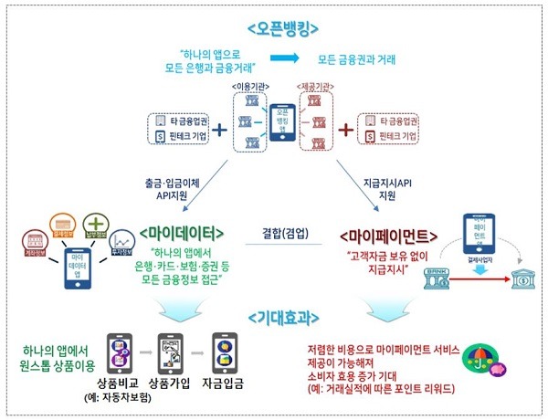 은행의 계좌정보 및 이체기능 개방에 초점을 둔 오픈뱅킹 개념을 여타업권·상품 추가 등을 통해 포괄적으로 확장하고, 다른 서비스·산업과의 연계 기반을 마련해 금융서비스의 혁신과 경쟁을 촉진하고 기존 금융서비스의 플랫폼화를 지원한다.