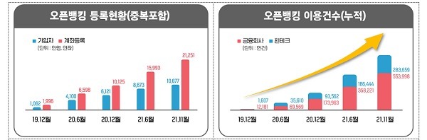 금융혁신을 촉진하기 위해 도입한 오픈뱅킹이 전면 시행 2년만에 순가입자수 3000만명을 넘어서고, 순등록계좌수는 1억개를 돌파한 것으로 나타났다.