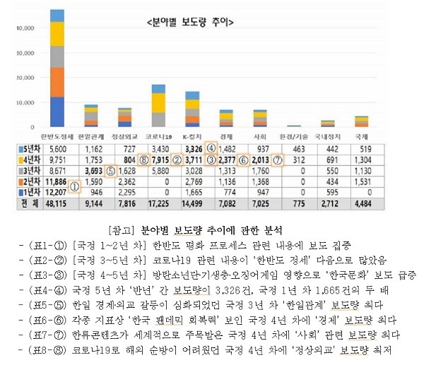 분야별로 보도 비중을 살펴보면 한반도 정세(38.4%) > 코로나19 대응(13.7%) > 한국문화(케이 컬처, 11.6%) > 한일관계(7.3%) > 정상외교(6.2%) > 경제(5.6%) > 사회(5.6%) > 국제(3.6%) > 국내정치·환경기술(2.8%) 순으로 나타났다.