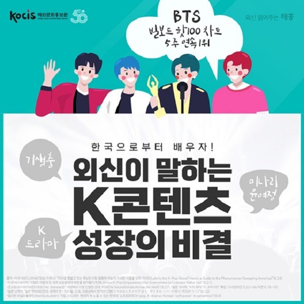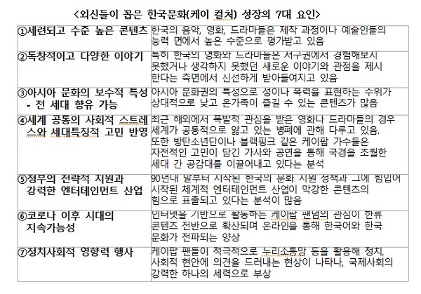 특히 지난해와 올해 ‘케이 붐’의 주된 계기로는 그룹 방탄소년단의 인기와 팬클럽 ‘아미’들의 활약, 봉준호 감독 영화 ‘기생충’의 칸 영화제 황금종려상 수상, 넷플릭스 콘텐츠 ‘오징어 게임’의 대성공 등을 거론했다.