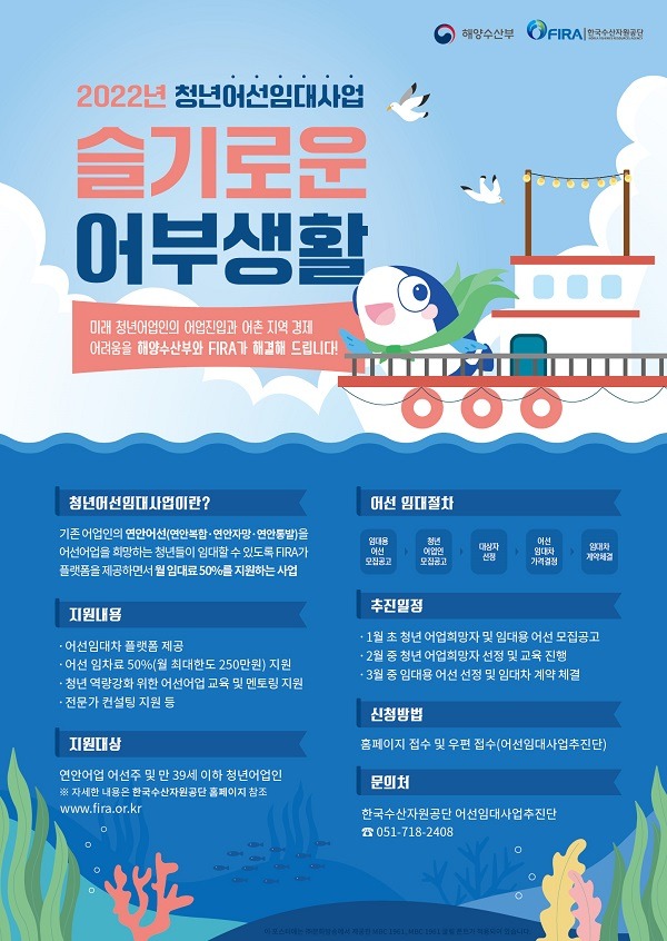 신청자가 많을 경우 만 39세 이하의 청년에게 우선권을 부여하며, 사업에 참가를 희망하는 청년은 내년 1월 10일부터 28일까지 한국수산자원공단 누리집(www.fira.or.kr) 및 우편을 통해 신청하면 된다.