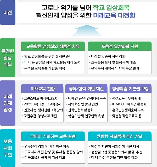 올해 업무계획에는 지난 4년 반 동안의 노력과 성과를 기반으로, 코로나 위기를 보다 현명하게 극복하고, 급변하는 사회를 선도하는 미래교육으로의 대전환을 지속하기 위한 방향과 전략이 담겼다.