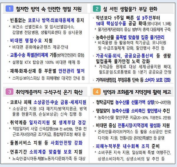 취약계층 일자리·생계지원 등 통한 지원 사각지대를 최소화한다. 이에따라 설 연휴 전까지 직접일자리 사업에서 60만명 이상을 채용하고, 설 연휴 전 근로·자녀장려금 조기 지급, 통합채무조정 신청 개시 등 저소득가구·청년 등의 생계부담 경감 및 자산형성을 지원한다.