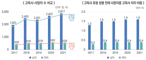 고독사 중 자살 사망 비중은 16.5∼19.5%이며 연령이 어릴수록 자살로 인한 고독사가 많았다.