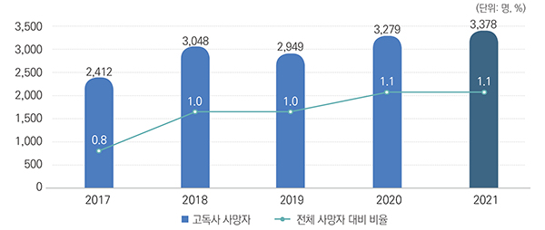 지난해 고독사 사망자는 모두 3378명으로, 2019년을 제외하면 증가 추세에 있다. 전체 사망자 수에서 차지하는 비중은 매년 약 1% 내외 수준이다.